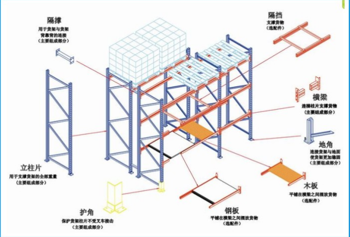 1.柱片以橫撐、斜撐以螺栓連接而成,柱片與抱焊粱插接組成貨架框架,采用主副架形式排列兩排,每個(gè)貨架組存放兩個(gè)單元(一個(gè)單元是一個(gè)托盤位);