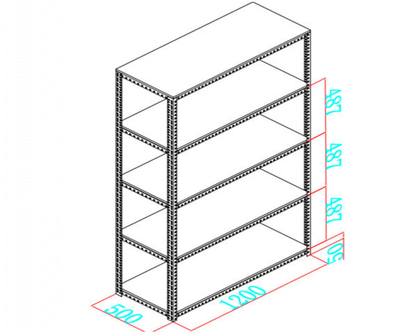 上圖是另外一個(gè)倉(cāng)儲(chǔ)貨架的設(shè)計(jì)圖,圖中標(biāo)注了貨架長(zhǎng)度1200mm,由圖中紅色劃線可以看出,該長(zhǎng)度包含了兩邊立柱的規(guī)格,所以該長(zhǎng)度是指?jìng)}儲(chǔ)貨架的外尺寸、外空、外徑。一般標(biāo)注該倉(cāng)儲(chǔ)貨架的尺寸規(guī)格時(shí)可以這樣寫:1200(外)*500*2000mm,或者1200*500*2000mm。標(biāo)注外尺寸時(shí)可以注明是外尺寸也可以不標(biāo)注,不標(biāo)注時(shí)默認(rèn)為外尺寸,但倉(cāng)儲(chǔ)貨架的長(zhǎng)度是內(nèi)尺寸時(shí)是必須標(biāo)注的。